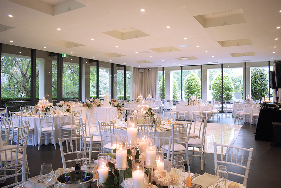 As your guests arrive, they’ll be welcomed into a peaceful, private courtyard surrounded by manicured hedges, willow trees, and the gentle sound of water. It’s the perfect setting for pre-ceremony drinks or post-‘I do’ canapés. Then, when the doors open, the celebration flows into a warm and inviting reception space flooded with natural light and surrounded by nature on three sides.